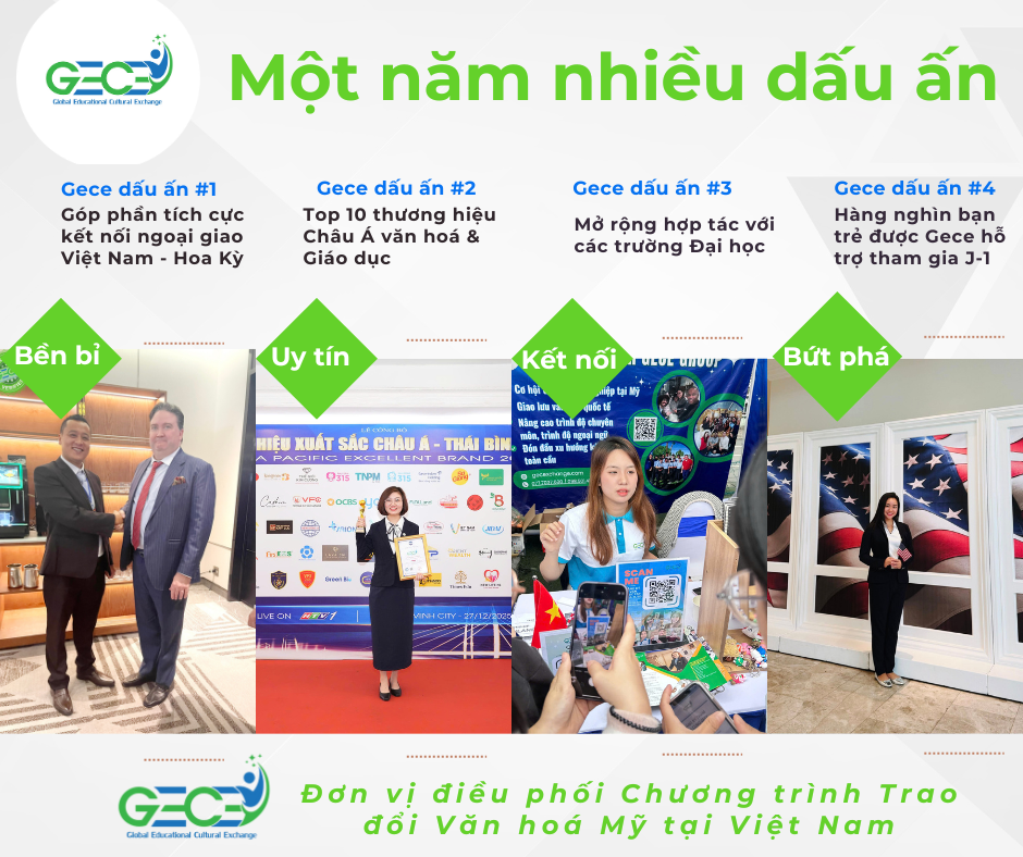 Năm qua, Gece tự cũng hào ghi dấu ấn mạnh mẽ trên bản đồ giáo dục văn hoá quốc tế khi vinh dự lọt Top 10 các đơn vị nổi bật Châu Á trong lĩnh vực kết nối văn hoá. Đây không chỉ là sự ghi nhận về thương hiệu mà còn đánh dấu năng lực kết nối quốc tế của đội ngũ những người làm Chương trình Thực tập Tu nghiệp Mỹ – Internship J1.